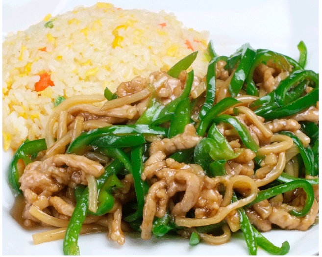 青椒肉絲炒飯特製炒飯と酢豚や回鍋肉などの定番中華料理がドッキングした、いいとこどりの一皿です。ボリューム満点のメニューです。